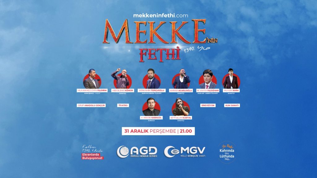 Mekke’nin Fethi’nin 1390’ıncı yıllında düzenlenecek program, 31 Aralık Perşembe akşamı saat 21.00’da başlayacak. Program TV5, Kanal 42, AGD TV ekranlarından ve sosyal medya hesaplarından canlı olarak yayınlanacak.