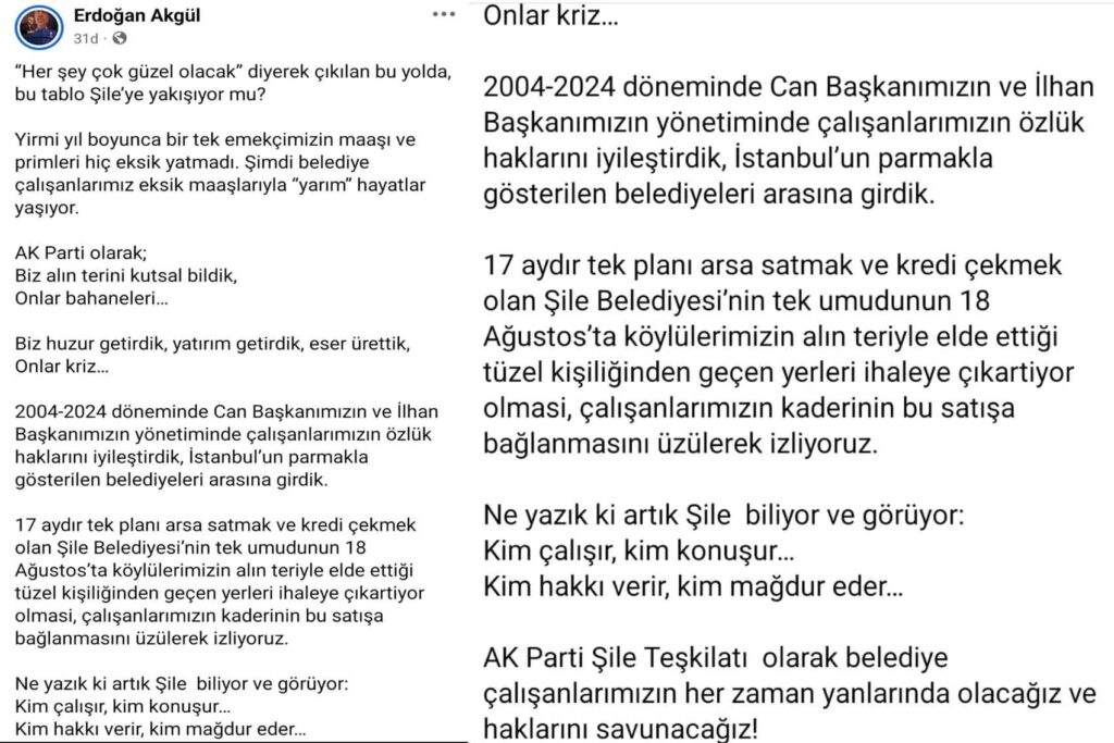2019-2024 döneminde İlhan Başkanımızın yönetiminde çalışanlarımızın özlük haklarını iyileştirdik, İstanbul’un parmakla gösterilen belediyeleri arasına girdik. 17 aydır tek planı arsa satmak ve kredi çekmek olan Şile Belediyesi’nin tek umudunun 18 Ağustos’ta köylülerimizin alın teriyle elde ettiği tüzel kişiliğinden geçen yerleri ihaleye çıkartıyor olması, çalışanlarımızın kaderinin bu satışa bağlanmasını üzülerek izliyoruz. Ne yazık ki artık Şile biliyor ve görüyor Kim çalışır, kim konuşur. Kimi hakkı verir, kimi mağdur eder.