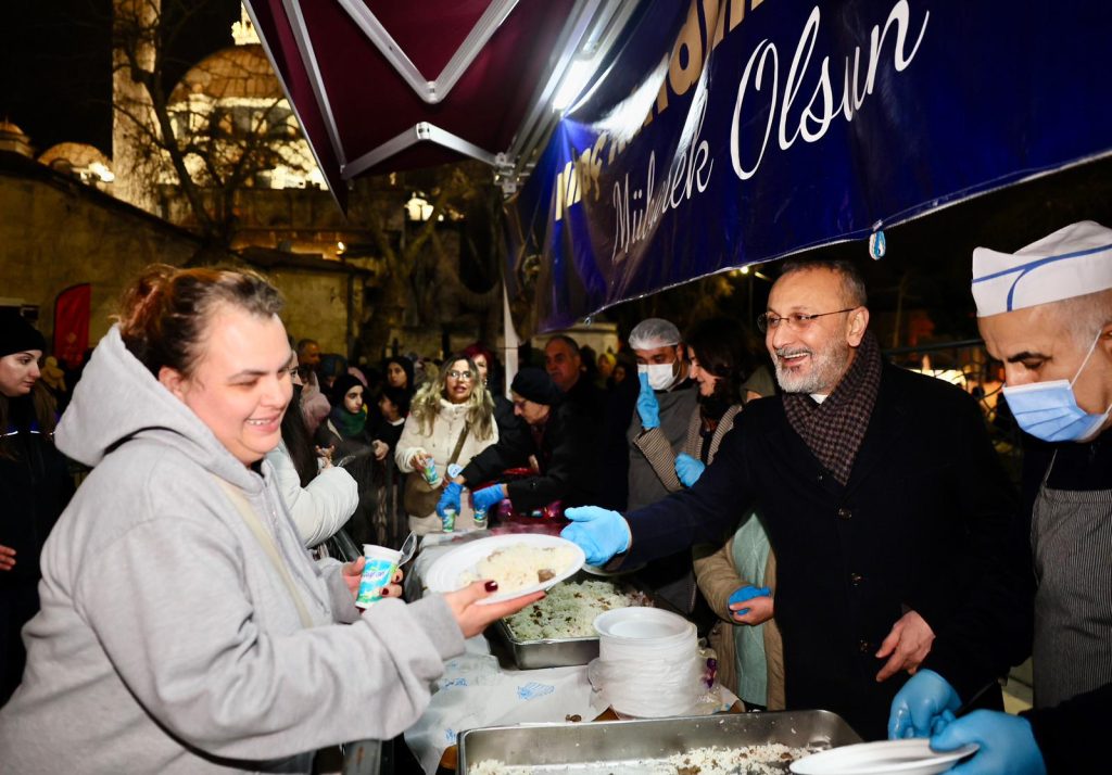 Kandil gecesinin huzurunun hissedildiği gecede Eyüpsultan Belediye Başkanı Dr. Mithat Bülent Özmen, Eyüpsultan Meydanı’na kurulan ikram alanında vatandaşlara etli pilav ikram etti.