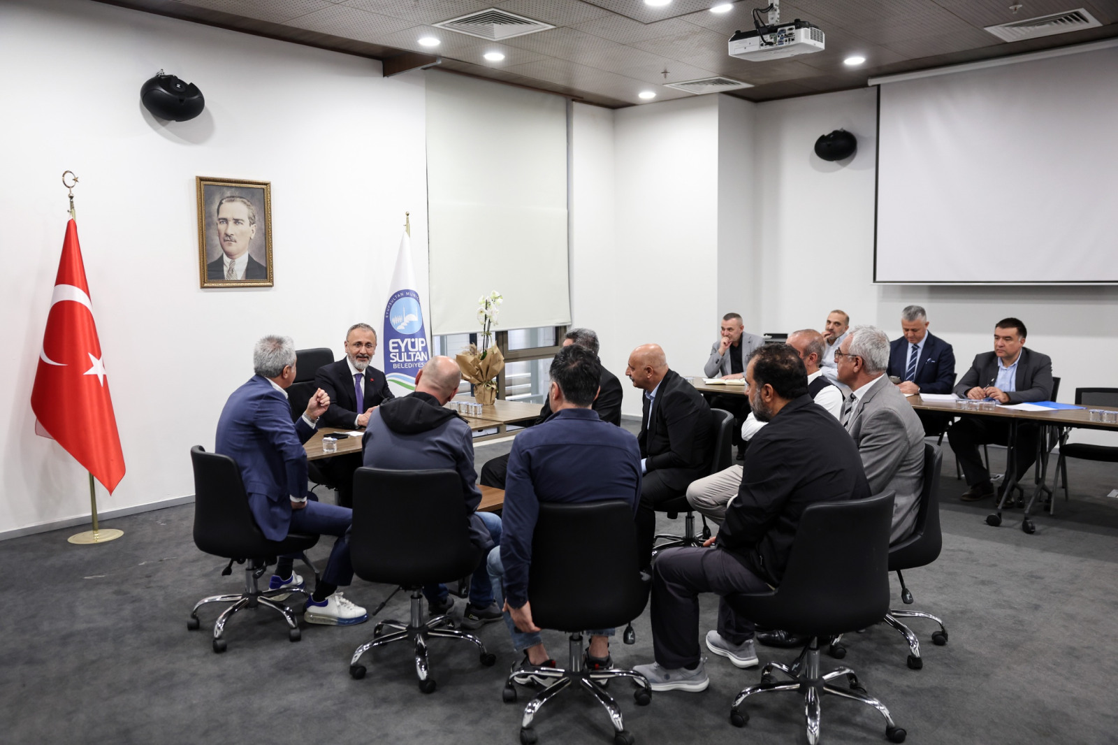 Eyüpsultan Belediyesi Başkanlık Binası’nda bulunan Necip Fazıl Kısakürek Salonu’nda ilçe sakinleri ile bir araya gelen Başkan Özmen, birim müdürleriyle birlikte vatandaşların istek ve taleplerini dinliyor.