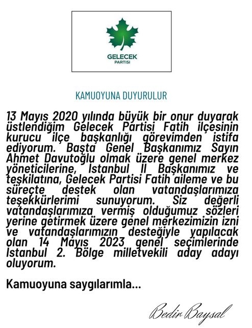Gelecek partisi Fatih Kurucu ilçe Başkanı Bedir Baysal, Milletvekili aday adaylığı için ilçe başkanlığından istifa etti..