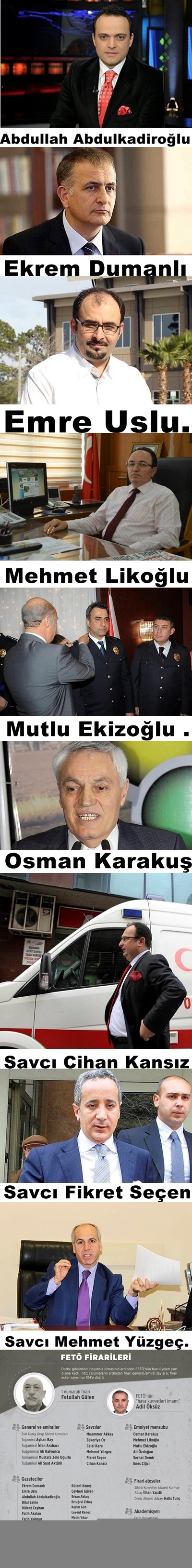 Fetullahçı Terör Örgütü’ne (FETÖ) yönelik soruşturmalar ve açılan davalarsebebiyle haklarında yakalama kararı bulunan Fetullah Gülen, Emre Uslu, Ekrem Dumanlı, Mustafa Zeki Uğurlu ve Adil Öksüz başta olmak üzere, aralarında asker, iş adamı, savcı, emniyet müdürü ve gazetecilerin de olduğu farklı mesleklerden çok sayıda kişi hala firari durumda bulunuyor..