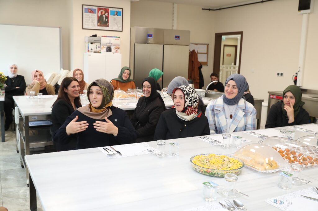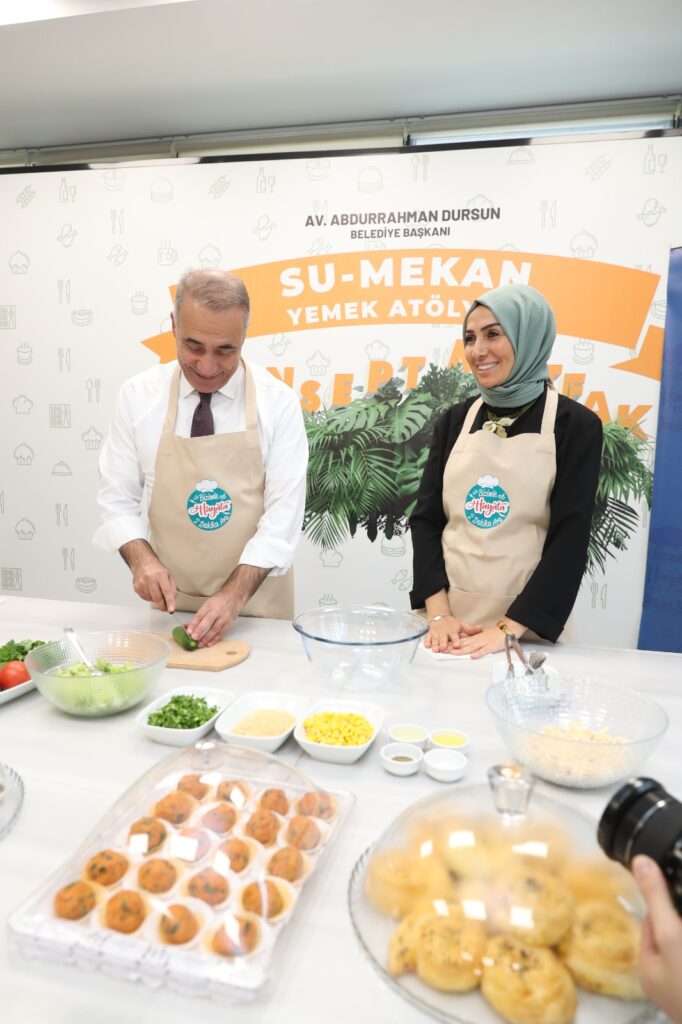 Mutfak önlüğünü takıp kollarını sıvadıktan sonra yemek atölyesi tezgâhının başına geçen Başkan Dursun eşi Tuba Dursun ile birlikte misafirleri için salata hazırladı.