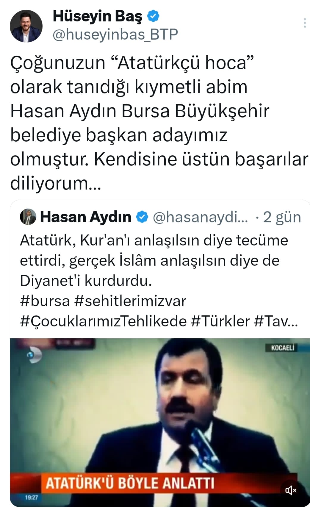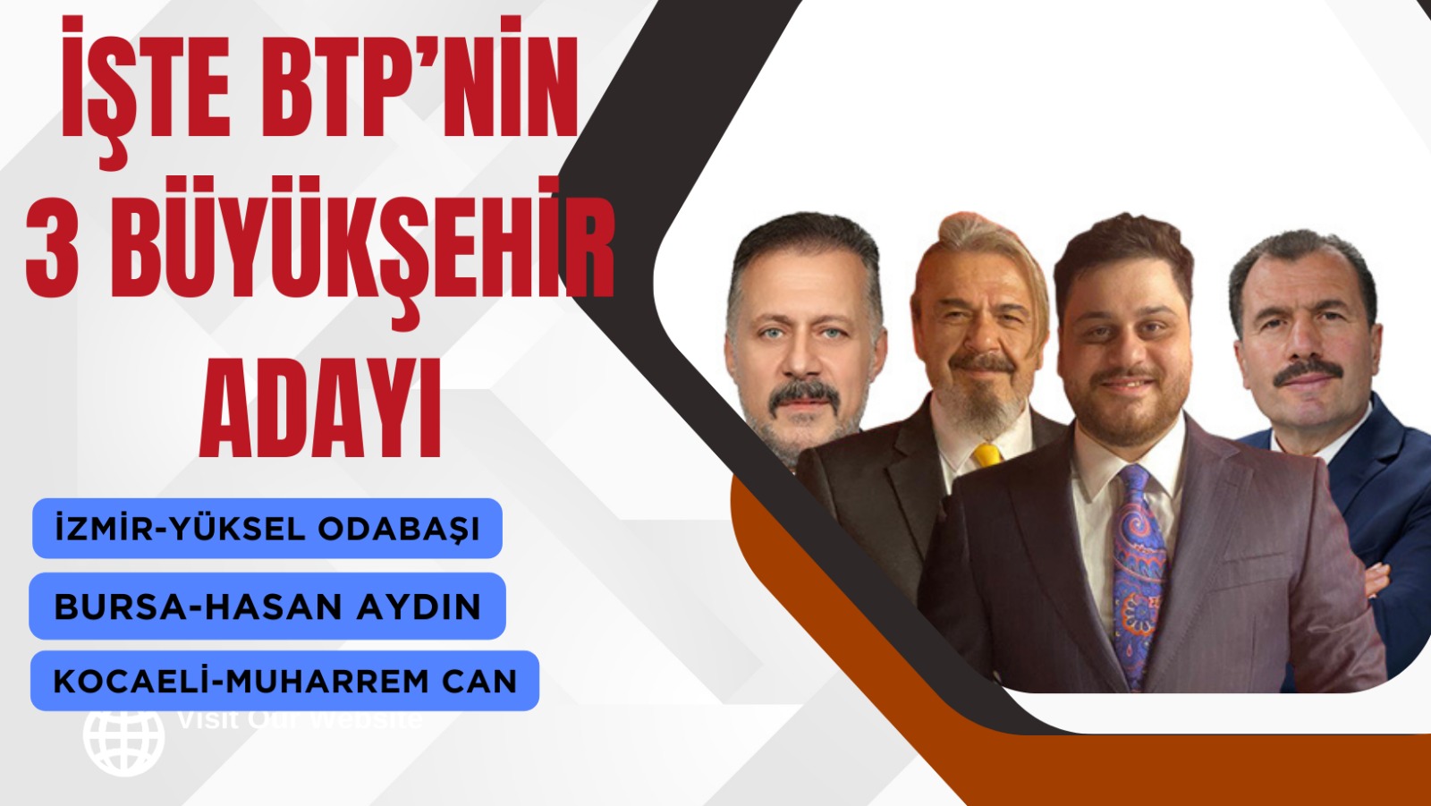 Yüksel Odabaşı ise “Laik ve çağdaşlığın temsilcisi güzide ilimiz “İzmir Büyükşehir Belediye Başkanlığı” için beni aday gösteren başta Sayın Genel Başkan Hüseyin Baş ve parti teşkilatlarına güvenlerinden ötürü sevgi, saygı ve teşekkürlerimi sunarım..! Uygun gördüler, ben de onur duyarak mutlulukla kabul ettim ! Seçime kadar ben İzmirli Kardeşlerime, umuyoruz ve diliyoruz ki, 1 Nisan sabahı da İzmirli Kardeşlerimiz bizlere emanet olacaktır! Allah hiçbirimizi utandırmasın! Ne bu, ne de diğer dünyada!” paylaşımı yaptı.Atatürkçü hoca Hasan Aydın Bursa adayı…BTP Genel Başkanı Hüseyin Baş’ın adayını ilan ettiği bir diğer kent Bursa oldu.Hüseyin Baş Bursa Büyükşehir Belediye Başkan adaylarının, yaptığı açıklamalar kamuoyunda büyük beğeni toplayan ilahiyatçı Hasan Aydın olduğunu açıkladı.Baş, “Çoğunuzun “Atatürkçü hoca” olarak tanıdığı kıymetli abim Hasan Aydın Bursa Büyükşehir belediye başkan adayımız olmuştur. Kendisine üstün başarılar diliyorum…” açıklaması yaptı.Kocaeli adayı işadamı Muharrem Can…
