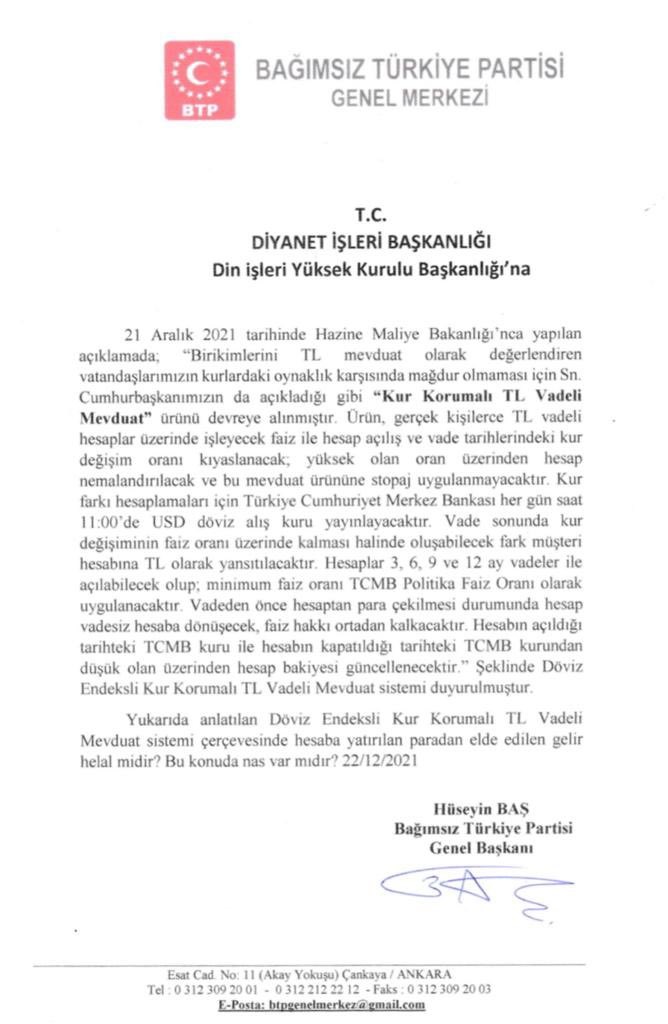 Bağımsız Türkiye Partisi (BTP) Döviz Endeksli Kur Korumalı TL Vadeli Mevduat Sistemi’nden el edilecek gelirin helal olup olmadığını resmi yazıyla Diyanet İşleri Başkanlığı’na sordu.