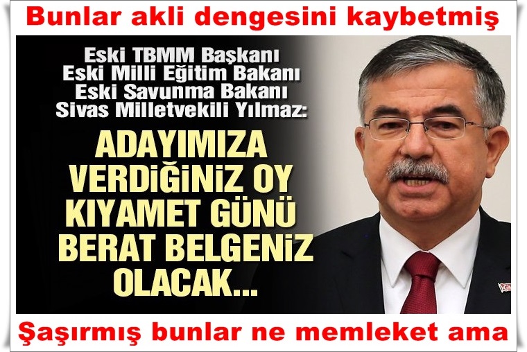 TBMM eski Başkanı, Milli Savunma ve Milli Eğitim eski Bakanı AKP Sivas Milletvekili İsmet Yılmaz, çok tartışılacak sözler söyledi. Yılmaz partisinin Sivas adayı Hilmi Bilgi için oy isterken, “Hilmi Bilgin’e vereceğiniz destek, kıyamet günü berat belgeniz olacak” dedi. Yılmaz’ın Sivas’ta yaptığı konuşmanın videosu internette yayınlandı ve sosyal medya kullanıcıları Yılmaz’a büyük tepki gösterdi.
