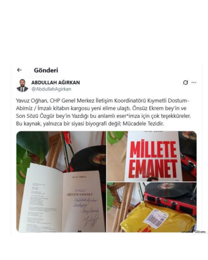 CHP Genel Merkez İletişim Koordinatörü ve Genel Başkan Baş Danışmanı Yavuz Oğhan’ın kaleme aldığı, önsözünü İstanbul Büyükşehir Belediye Başkanı Ekrem İmamoğlu’nun, son sözünü ise CHP Genel Başkanı Özgür Özel’in yazdığı kitabı Abdullah Ağırkan’a imzalı şeklide gönderildi…