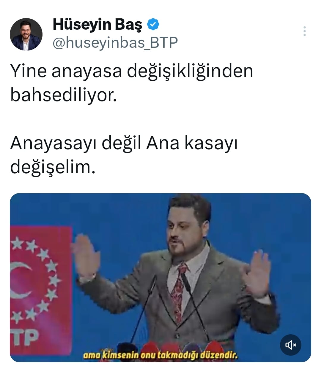 BTP Genel Başkanı Hüseyin Baş sosyal medya hesabından, ‘Çeşitli millet, çeşitli devlet, çeşitli bayrak, çeşitli vatan’ anayasanızı kabul etmeyeceğiz” paylaşımı yaptı.