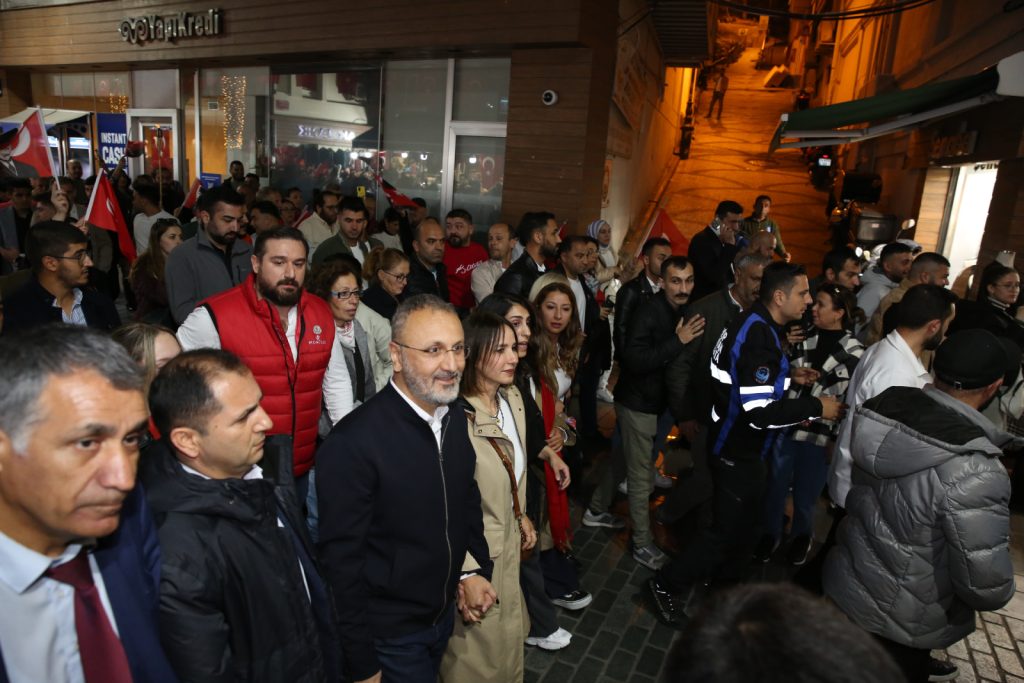 Fahri Korutürk Caddesi’nde başlayan ve yoğun bir katılımla gerçekleşen yürüyüşte, vatandaşlar ellerinde taşıdıkları Türk bayrakları ve meşalelerle tam bir görsel şölen oluşturdu. Bandonun marşları eşliğinde yürüyen vatandaşlar hep bir ağızdan İzmir Marşı’nı söyledi.
