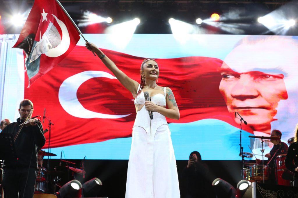 Sahnede kaldığı süre boyunca sevilen şarkılarıyla izleyenlere cumhuriyet coşkusunu yaşatan Melek Mosso, konserin sonunda elinde Türk bayrağı ile seslendirdiği İzmir Marşı’yla muhteşem bir final yaptı.