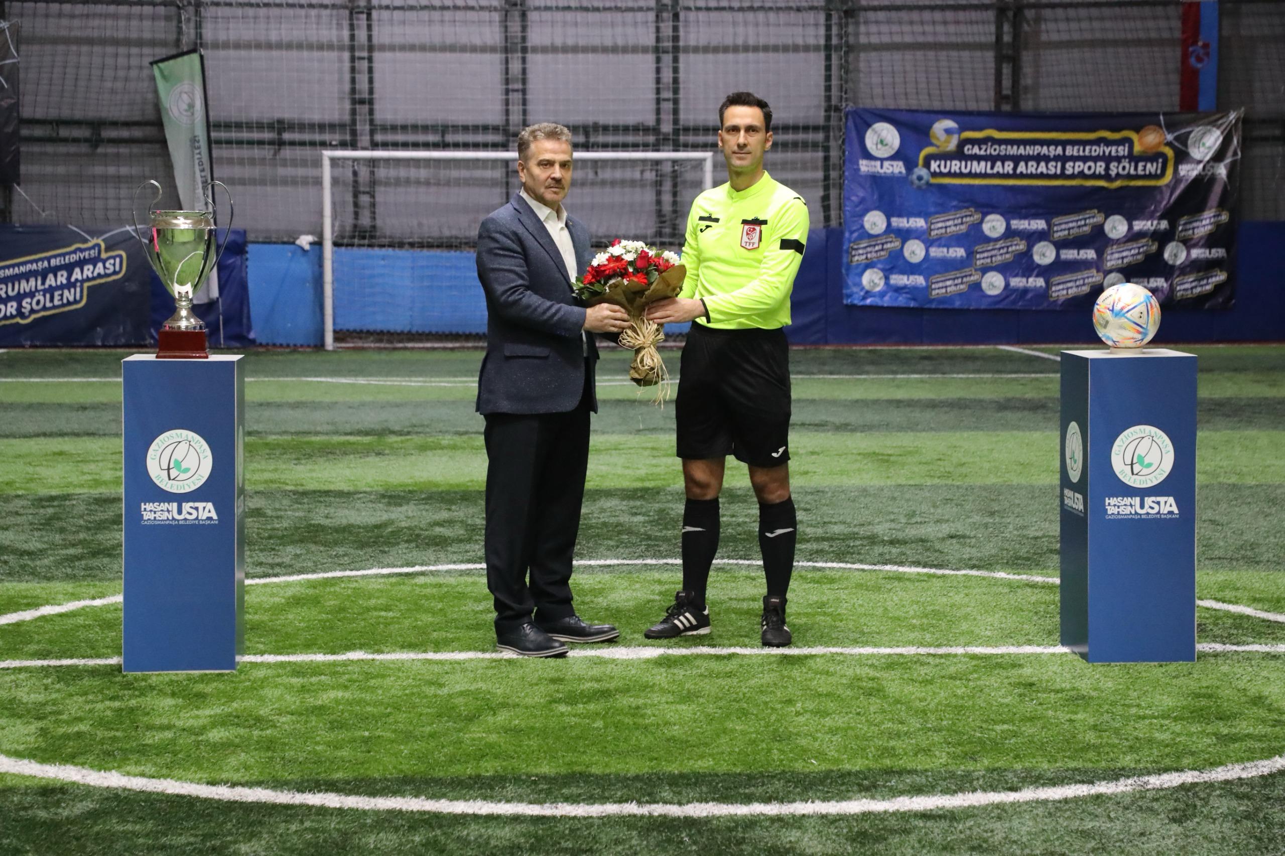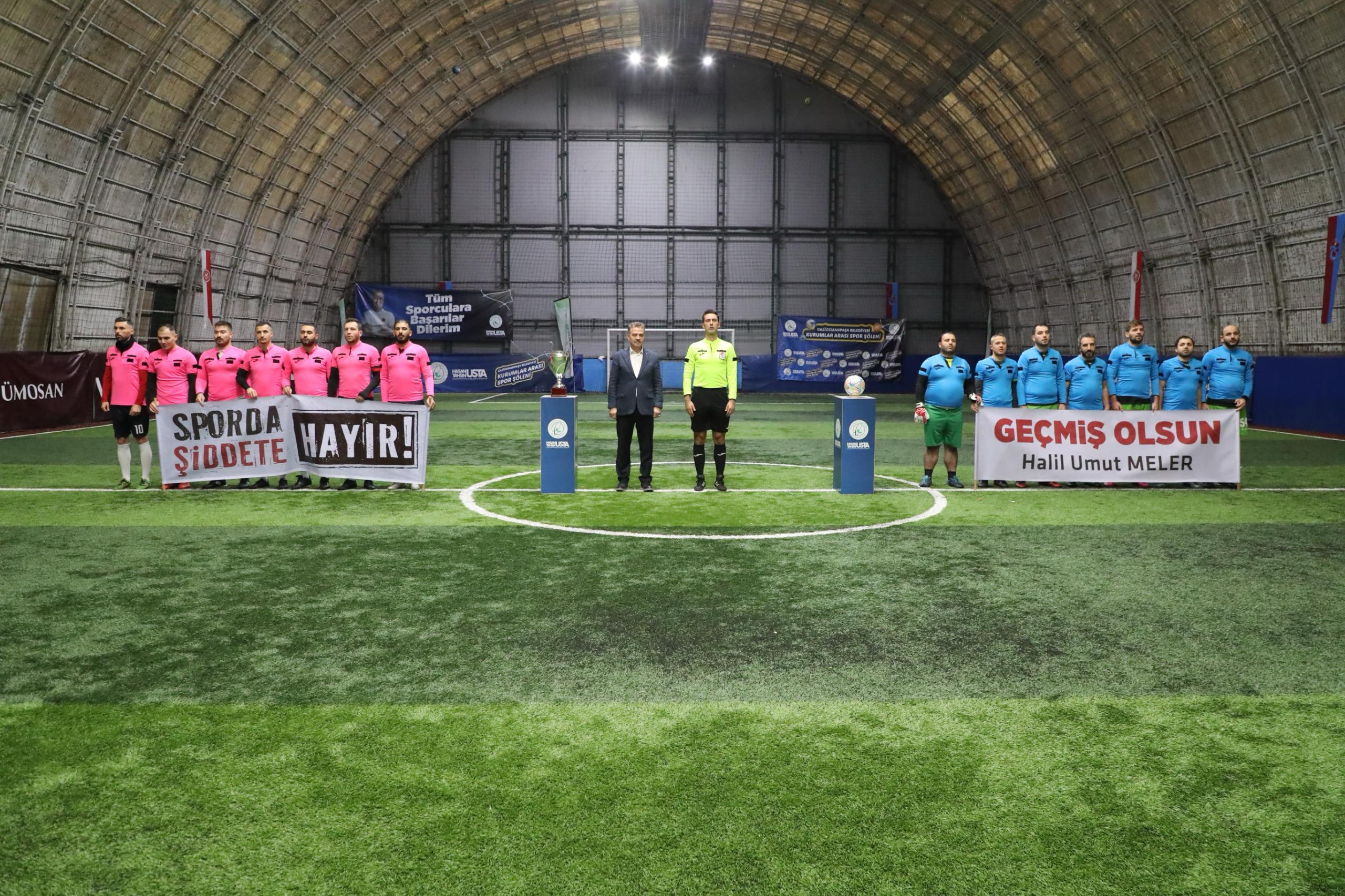 Gaziosmanpaşa Belediyesi tarafından düzenlenen Kurumlar Arası Spor Şöleni, futbol branşında oynanan final müsabakası ile tamamlandı. TFF Üst Klasman Hakemi Mustafa Kürşad Filiz yönetiminde gerçekleştirilen müsabaka, Gaziosmanpaşa Belediyesi Destek Hizmetleri Müdürlüğü takımı ile Gençlik ve Spor Hizmetleri Müdürlüğü takımını karşı karşıya getirdi.TAKIMLAR SAHAYA HAKEM FORMASIYLA ÇIKTIMüsabaka öncesi iki takım da son haftalarda futbolumuzda yaşanan üzücü şiddet olaylarına tepki göstermek için seramoniye hakem forması giyerek çıktı. “Geçmiş Olsun Halil Umut Meler” ve “Sporda Şiddete Hayır” yazılı pankartlarla sahaya çıkan oyunculara, Gaziosmanpaşa Belediye Başkanı Hasan Tahsin Usta da destek verdi. Usta, müsabaka öncesi hakem Mustafa Kürşad Filiz’e çiçek takdim etti. Centilmenlik içerisinde oynanan maçı 5-3 kazanan Destek Hizmetleri Müdürlüğü, kupanın sahibi oldu.