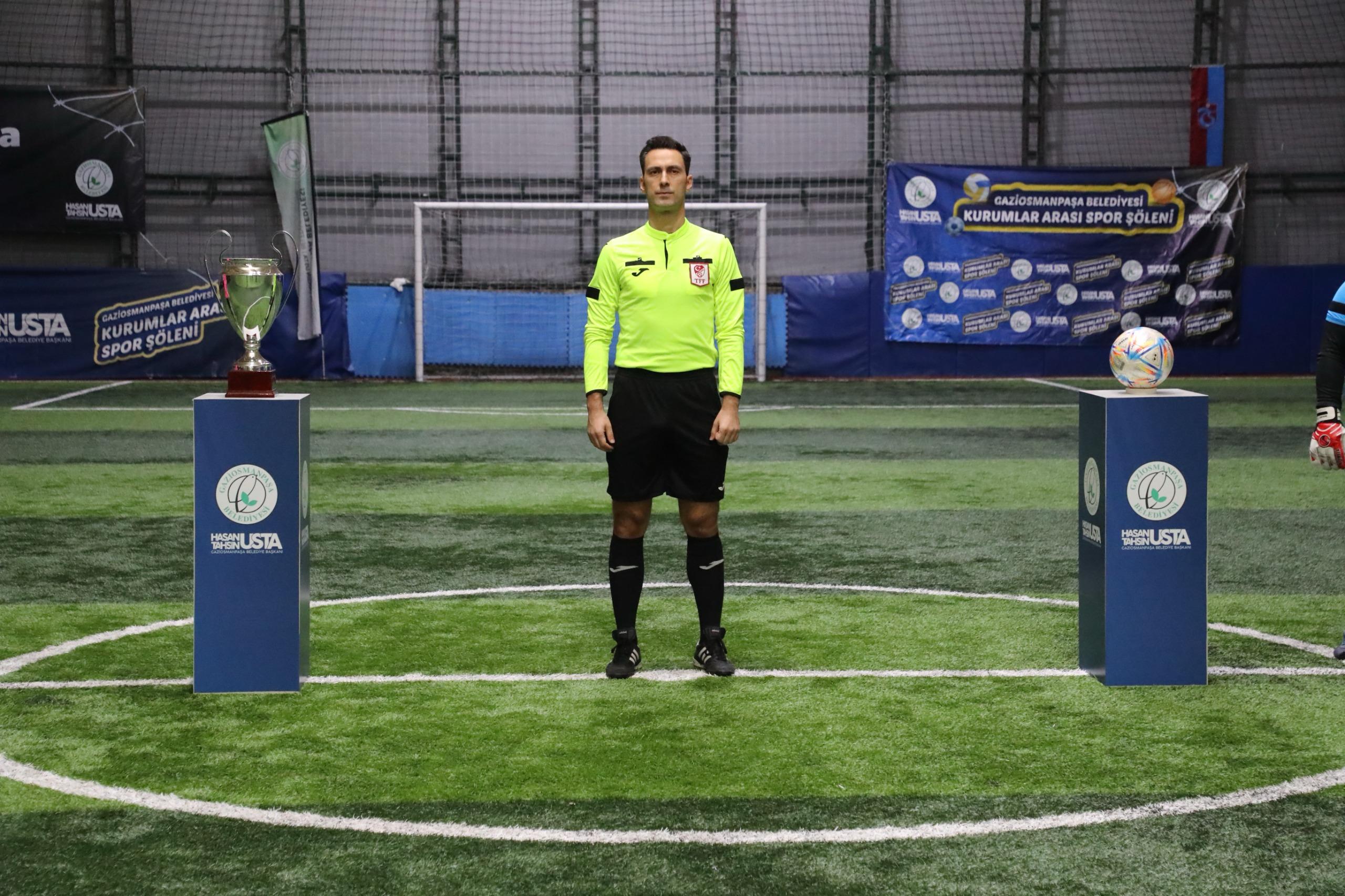 Gaziosmanpaşa Belediyesi tarafından düzenlenen Kurumlar Arası Spor Şöleni, futbol branşında oynanan final müsabakası ile tamamlandı. TFF Üst Klasman Hakemi Mustafa Kürşad Filiz yönetiminde gerçekleştirilen müsabaka, Gaziosmanpaşa Belediyesi Destek Hizmetleri Müdürlüğü takımı ile Gençlik ve Spor Hizmetleri Müdürlüğü takımını karşı karşıya getirdi.TAKIMLAR SAHAYA HAKEM FORMASIYLA ÇIKTIMüsabaka öncesi iki takım da son haftalarda futbolumuzda yaşanan üzücü şiddet olaylarına tepki göstermek için seramoniye hakem forması giyerek çıktı. “Geçmiş Olsun Halil Umut Meler” ve “Sporda Şiddete Hayır” yazılı pankartlarla sahaya çıkan oyunculara, Gaziosmanpaşa Belediye Başkanı Hasan Tahsin Usta da destek verdi. Usta, müsabaka öncesi hakem Mustafa Kürşad Filiz’e çiçek takdim etti. Centilmenlik içerisinde oynanan maçı 5-3 kazanan Destek Hizmetleri Müdürlüğü, kupanın sahibi oldu.