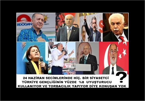 24 HAZİRAN SECİMLERİNDE HİÇ. BİR SİYASETCİ TÜRKİYE GENÇLİĞİNİN YÜZDE %8 UYUŞTURUCU KULLANIYOR VE TORBACILIK YAPIYOR DİYE KONUŞAN YOK