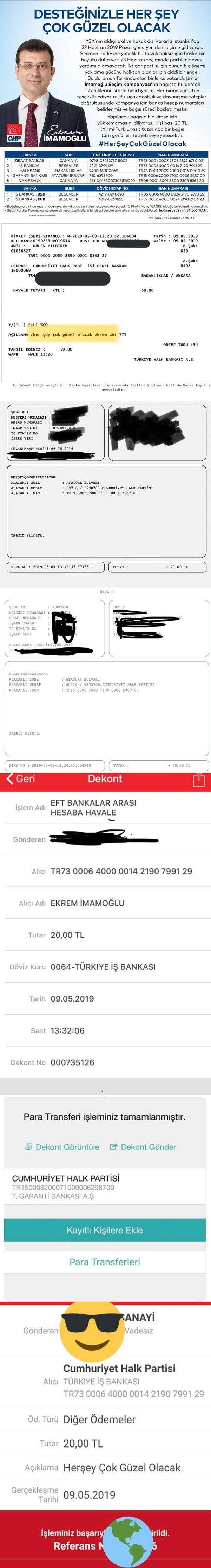 CHP Genel Merkezi tarafından başlatılan ve “Desteğinizle her şey çok güzel olacak” sloganı ile başlatılan Ekrem İmamoğlu kampanyasının duyurusunda “YSK’nın aldığı akıl ve hukuk dışı kararla İstanbul’da 23 Haziran 2019 Pazar günü yeniden seçime gidiyoruz. Seçmen iradesine yönelik bu büyük haksızlığın başka bir boyutu daha var. 23 Haziran seçiminde partiler hazine yardımı alamayacak. İktidar partisi için bunun hiç önemi yok. Ama gücünü halktan alanlar için ciddi bir engel. Bu durumun farkında olan binlerce vatandaşımız, İmamoğlu Seçim Kampanyası’na bağışta bulunmak istediklerini ısrarla belirtiyor. Her birine yürekten teşekkür ediyoruz. Bu sıcak dostluk ve dayanışma talepleri doğrultusunda kampanya için banka hesap numaraları belirlenmiş ve bağış süreci başlatılmıştır. Yapılacak bağışın hiç kimse için yük olmamasını diliyoruz. Kişi başı 20 TL(yirmi Türk Lirası) tutarında bir bağış tüm gönülleri fethetmeye yetecektir. #HerŞeyÇokGüzelOlacak” denildi.