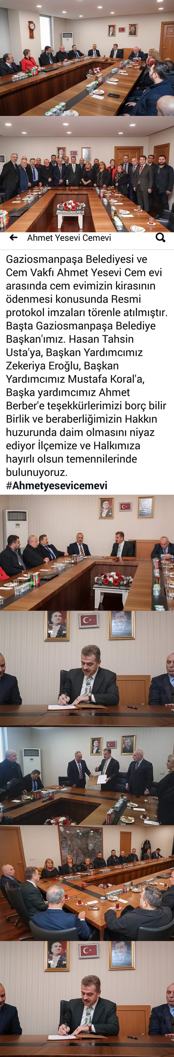 Gaziosmanpaşa Belediyesi Toplantı Salonu’nda gerçekleştirilen imza törenine Gaziosmanpaşa Belediye Başkanı Hasan Tahsin Usta, Hoca Ahmet Yesevi Cemevi Dernek Başkanı Şahin Çolak ve dernek yöneticileri katıldı. İmzalanan protokole göre derneğin amaç ve inancı doğrultusunda düzenleyeceği eğitim, kültür ve sanat faaliyetleri için Gaziosmanpaşa Belediyesi tarafından bir hizmet binası tahsis edilecek. Hizmet binasında ülkemizin kültürel değerlerine katkıda bulunması amacıyla seminer, konferans, araştırmalar ve kurslar düzenlenecek.