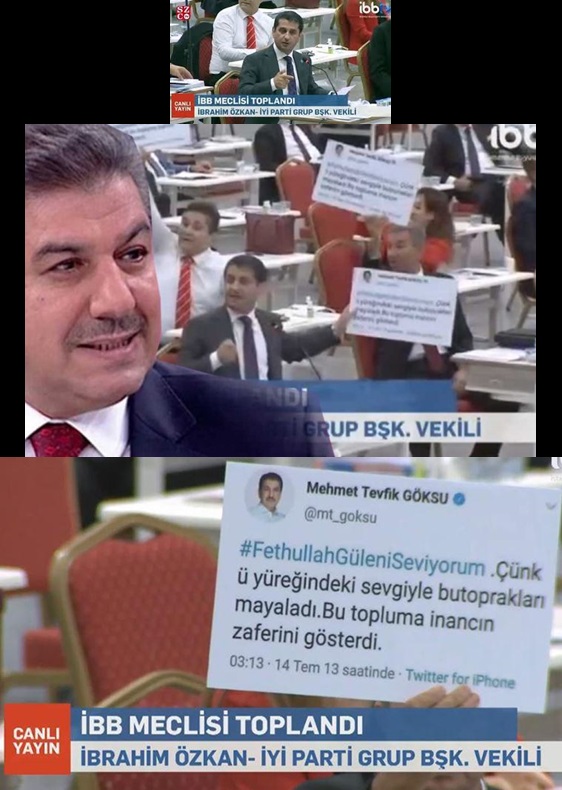 Özkan, “Sayın Göksu bizim ile ilgili hala büfe, hala kurban pazarı ile ilgili konuşmaya devam ederse dün 15 Temmuz’un ruhaniyeti ile ilgili, sürekli olarak buradan bunu göstereceğiz” diyerek partilileri ile birlikte Göksu’nun daha önce attığı “#FethullahGüleniSeviyorum. Çünkü yüreğindeki sevgiyle bu toprakları mayaladı. Bu topluma inancın zaferini gösterdi” tweetinin yazılı olduğu dövizleri kaldırdılar.
