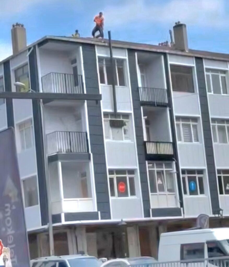 İstanbul Kurtköy’de bir dükkanın tadilatında çalışan bir işçi, güvenlik önlemleri almadan boruyu iple çatıya çekmeye çalışırken, boru yere düştü.