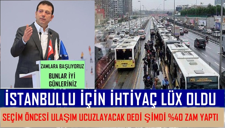 İstanbul “un Ekrem İmamoğlu”ile imtihanı devam ediyor. Seçimler öncesi Ulaşım Lüx değil ihtiyaç dedi. Biz 16 Milyon İstanbullu için ulaşımda gerekirse zarar ederiz diyerek sempatileri üzerine toplayan İmamoğlu İstanbul , da seçimleri kazanması için ulaşımı ucuzlatacağının altını çizmişti. Şimdi ise Zarar ediyoruz diyerek & 40 oranında zam yaparak Söyledikleri ile çelişmekte son yılların şampiyonu oldu. Son yıllarda, yapılan zamların en büyüğü ile karşılaşan İstanbullunun sesi soluğu kesildi.