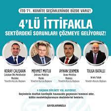MASKO Yönetim Kurulu Başkanı ve İkitelli OSB Yönetim Kurulu Başkan Yardımcısı Mehmet Mutlu. MODOKO Yönetim Kurulu Başkanı Koray Çalışkan, MODESA Yönetim Kurulu Başkanı Ayhan Sekmen ve ARMİS YATAK Yönetim Kurulu Başkanı Tolga Batallı’nın oluşturduğu 4’lü ittifak; “seçimlerin dostluk, kardeşlik havasında geçmesini temenni ederek tüm meslektaşlarının desteklerini talep ediyor”.