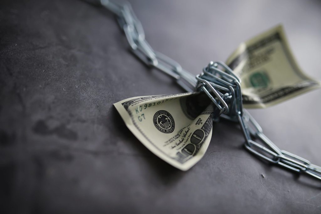 Business concept. The depreciation of national currency. Hundred dollar bill. Inflation and stagnation. Tighten the hundred dollar bill with a measuring chain.