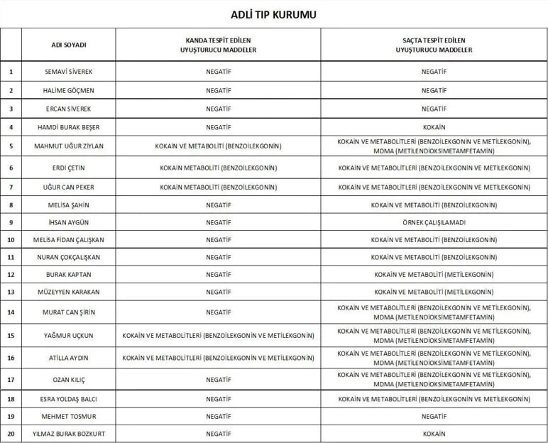 İstanbul Cumhuriyet Başsavcılığı‘nın ünlü isimlere yönelik yürüttüğü uyuşturucu soruşturması, Rabia Karaca’nın tutuklanmasıyla yeni bir boyut kazandı. Soruşturmada, Momo restoranların sahibi Hamdi Burak Beşer, FLO Yönetim Kurulu üyesi Mahmut Uğur Ziylan, model Melisa Fidan Çalışkan ve sosyal medya fenomeni Melisa Şahin gibi isimlerin kokain testleri pozitif çıktı. Hem kan hem saç testinde pozitif çıkanlar arasında Mahmut Uğur Ziylan, Erdi Çetin, Uğur Can Peker, Yağmur Uçkun ve Atilla Aydın yer alıyor. Yalnızca saç testinde pozitif çıkanlar ise Melisa Fidan Çalışkan, Melisa Şahin, Nuran Çokçalışkan, Burak Kaptan, Müzeyyen Karakan, Murat Can Şirin, Ozan Kılıç, Esra Yoldaş Balcı, Hamdi Burak Beşer ve Yılmaz Burak Bozkurt.
