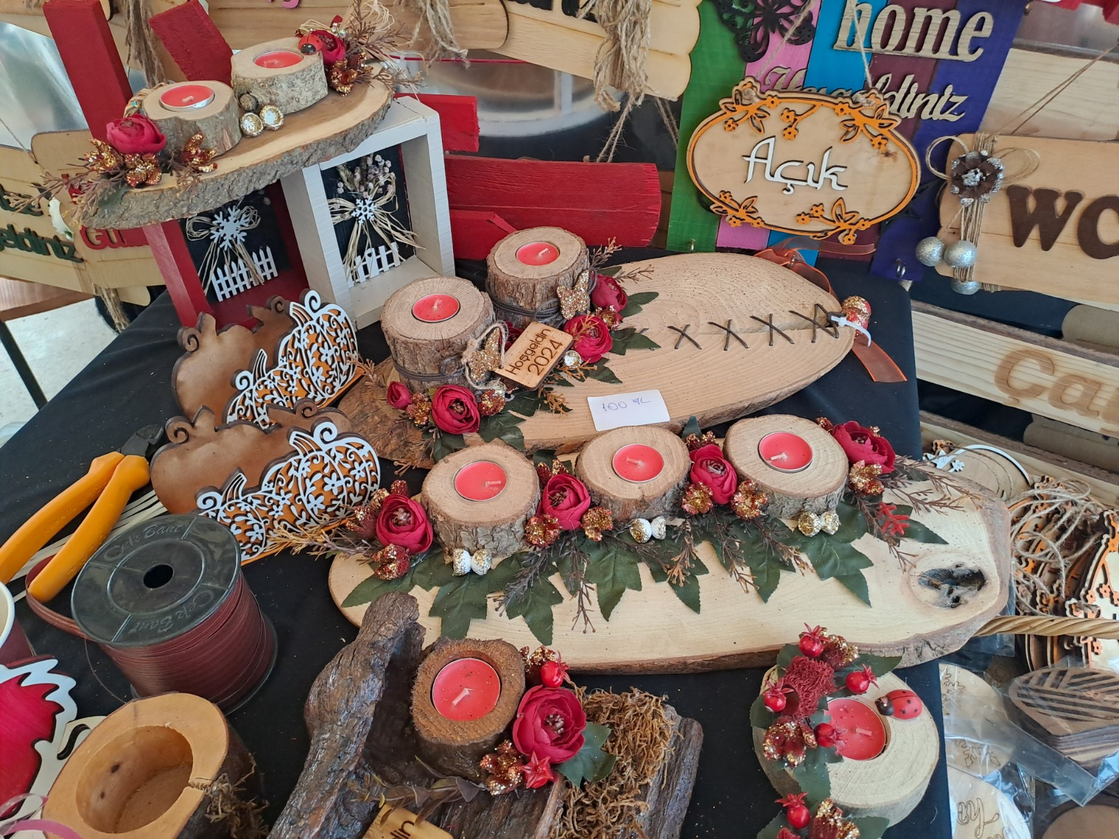 El emekleri yiyeceğimiz emekler var, geri dönüşüm ürünleri var kabak oyma sanatı var. Takı tasarım sanatı var. Böyle gördüğünüz gibi bakın bu da bir demin alışveriş yaptım ben de. Kadınımız bunu boncuk düzerek yapmış.