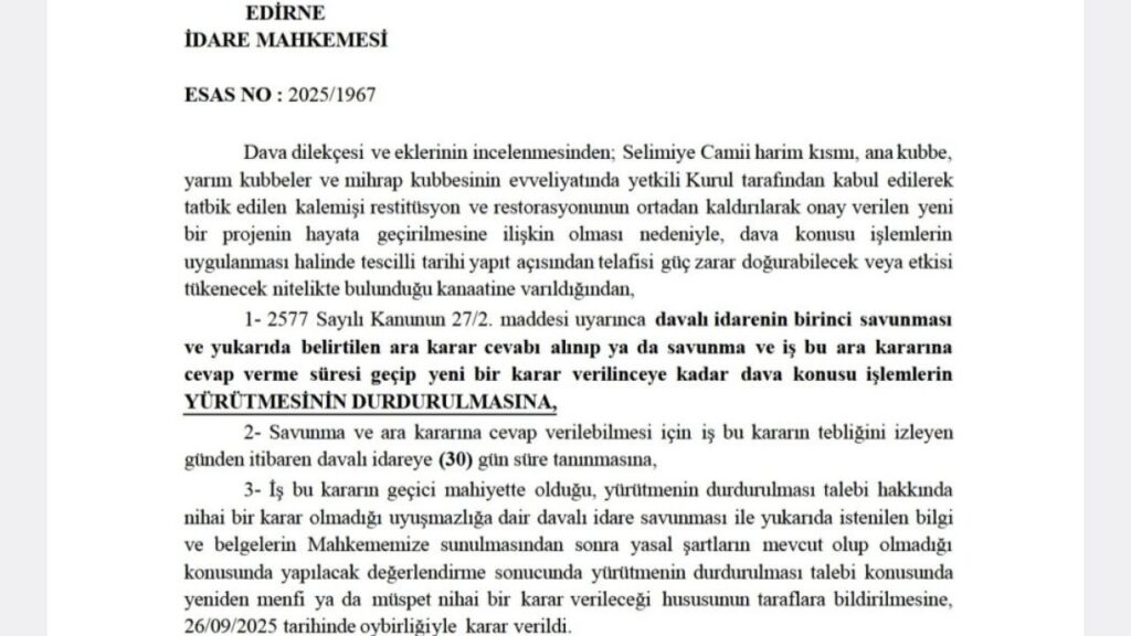 Edirne İdare Mahkemesi, 27 Eylül 2025 tarihli oturumda, yürütmeyi durdurdu – gerekçe, “tarihi yapının özgünlüğünü bozma riski”. Mahkeme, değişikliklerin önceki restorasyonları geçersiz kılabileceğini, telafisi güç zararlar doğurabileceğini belirtti. Bakanlığa verilen 30 günlük süre, projenin teknik dayanaklarını, itiraz yanıtlarını ve belgeleri kapsıyor. Bu karar, Cumhuriyet Gazetesi’nde “Tepki çeken restorasyona mahkemeden dur” diye manşetlendi. Hürriyet ise “Selimiye’de restorasyona durdurma” başlığıyla, ulusal çapta yayılmasını sağladı.