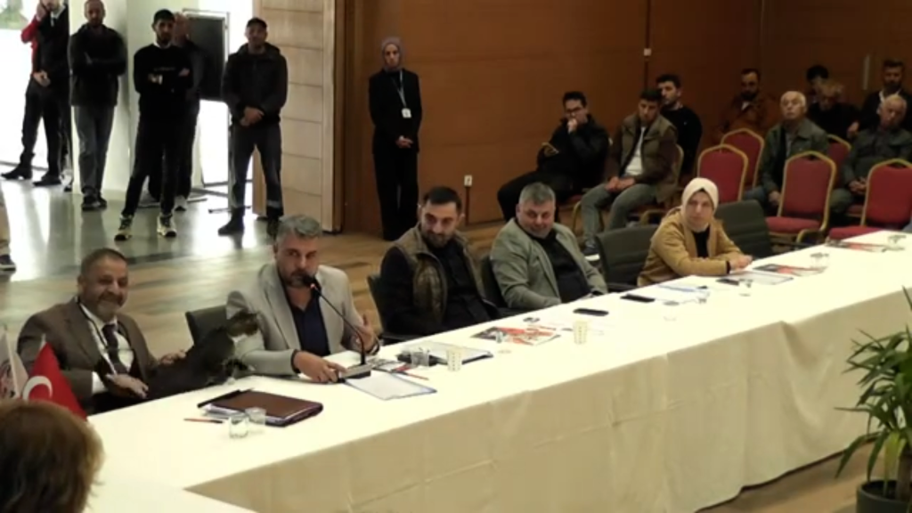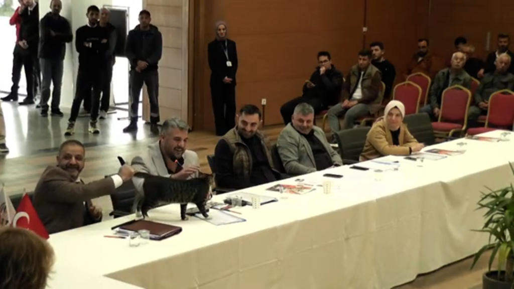 Meclis üyesi Onur Taylan’nın konuşması sonunda masaya aniden gelen kedi yüzleri güldürdü.