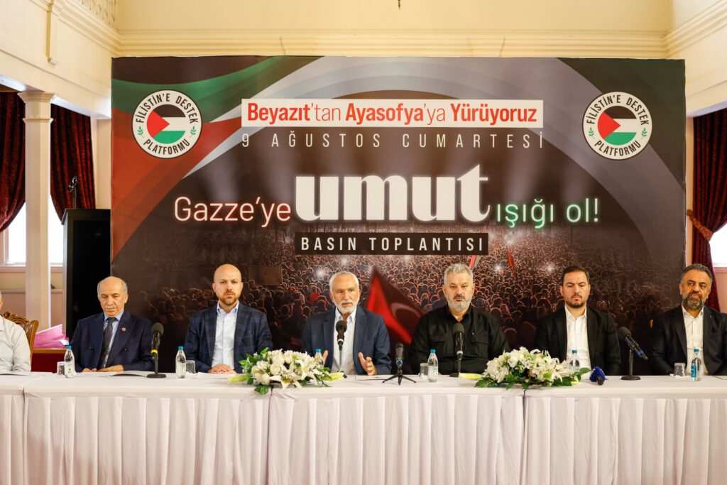 Okunan bildiride, 9 Ağustos’ta yapılacak olan yürüyüşe çağrıda bulunuldu, “7 Ekim’den sonra İsrail, sadece askerî hedefleri değil; hastaneleri, okulları, ibadethaneleri, ambulansları, yardım konvoylarını ve çocuk parklarını bombaladı. Kadınlar, çocuklar, yaşlılar, sivil erkekler; kimin yaşayıp kimin öleceğine karar verilen bir oyun tahtasında hedef hâline geldi. İşte biz de bu haklı mücadeleden ilham alarak halkımızı büyük bir yürüyüşe davet ediyoruz. Gazze’ye bir umut ışığı taşımak için, bu zulmün karanlığını delmek için; kararlılıkla, sessizlikle değil ama vakar ve onurla yürümek için, 9 Ağustos Cumartesi günü akşam namazı sonrasında Beyazıt Meydanı’nda buluşacağız. Oradan Ayasofya Camii’ne doğru, ellerimizdeki fenerlerle yürüyeceğiz. Çünkü bu yürüyüş, sadece sembolik bir hareket değildir. Bu yürüyüş, Gazze’ye ulaştırılmak istenen umut, onur ve dayanışma mesajıdır.”