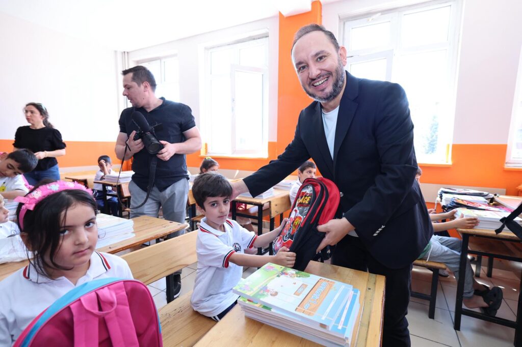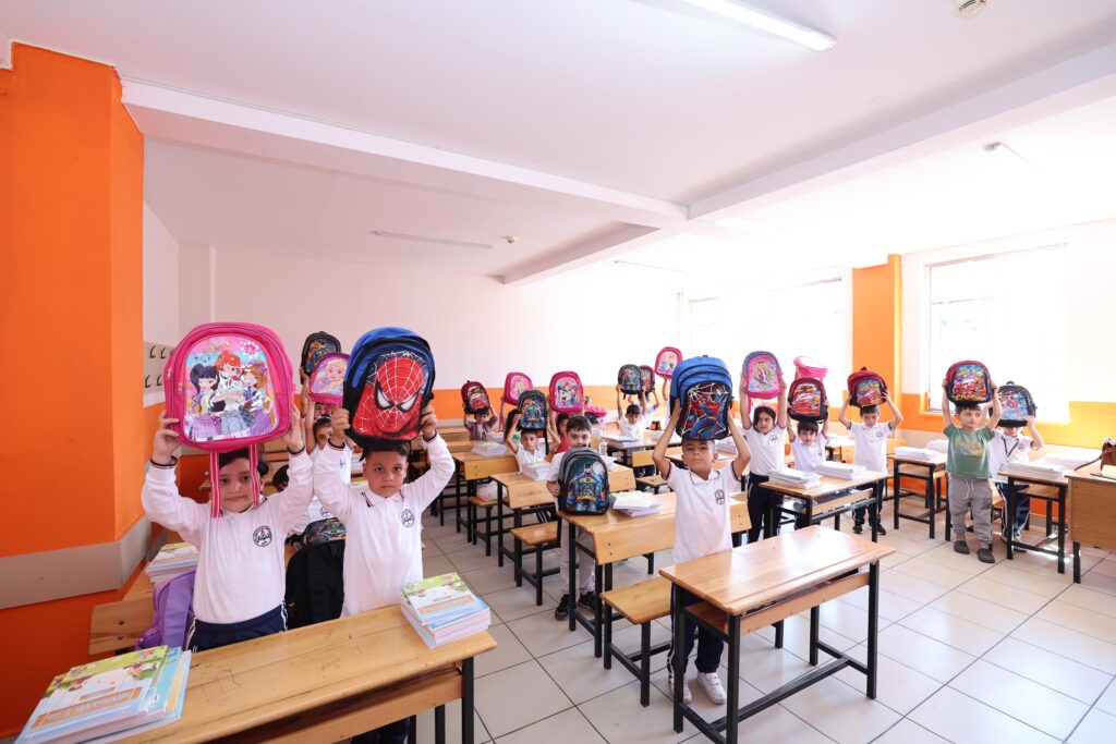 Öğrencilere hediye edilen okul çantalarının içerisinde beslenme çantası ile birlikte abaküs, kalemtıraş, silgi, 12’li kuru boya kalemi, güzel yazı defteri, çizgili defter, kareli defter, resim defteri, kırmızı kalem, kurşun kalem, cetvel ve kalemlik bulunuyor.