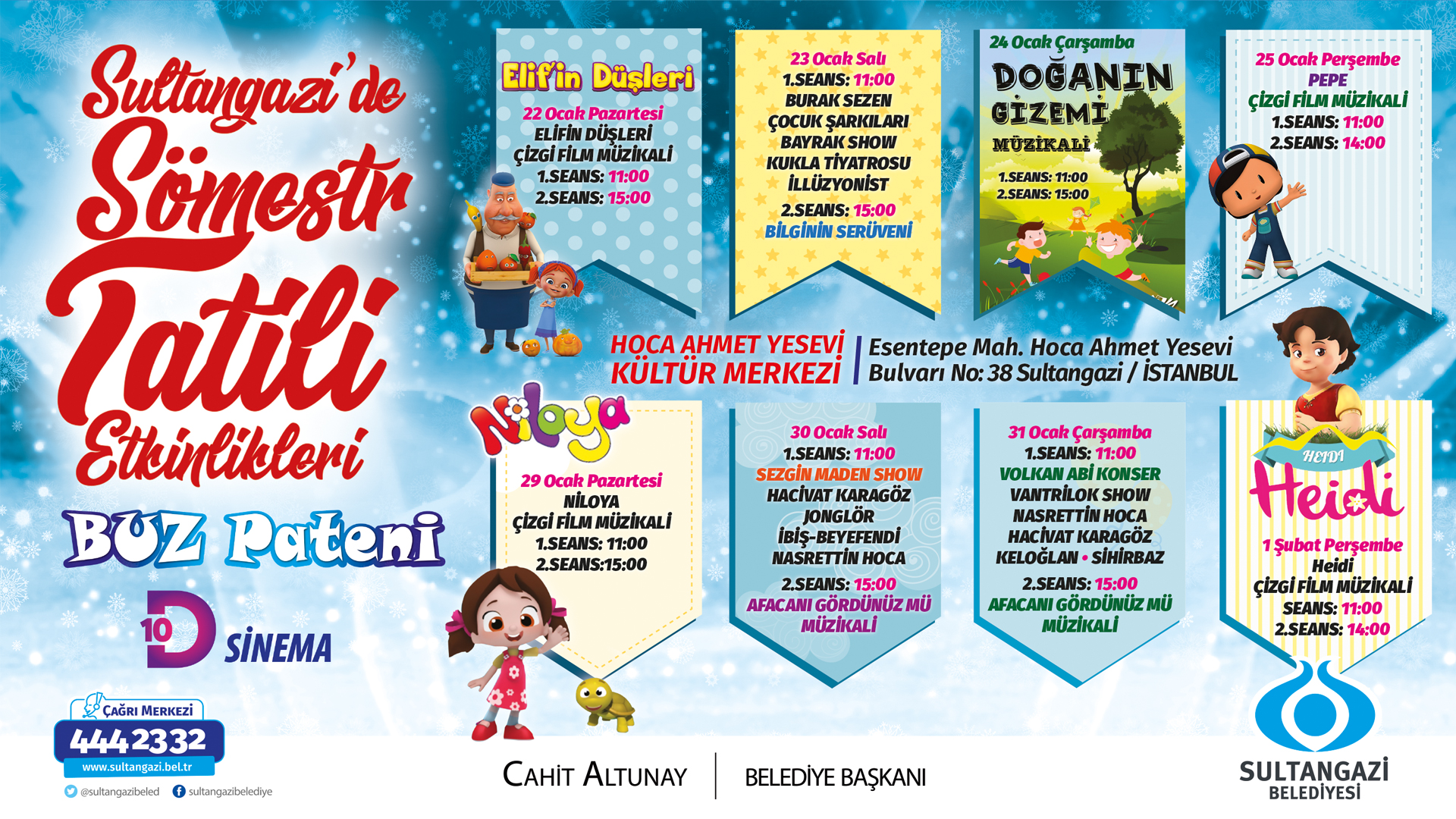 Sultangazi Belediyesi, öğrencilerin sömestr tatilinde eğlenceli vakit geçirmelerini sağlamak amacıyla bir dizi etkinlik düzenliyor. Kurulan buz pistinde öğrencilere farklı deneyimler yaşatılırken, 10 D sinema salonun da ise çeşitli film gösterimleri sunulacak. Bununla da yetinmeyen Sultangazi Belediyesi, İBB Hoca Ahmet Yesevi Kültür Merkezi’nde bir dizi kültürel etkinlikler düzenliyor.
