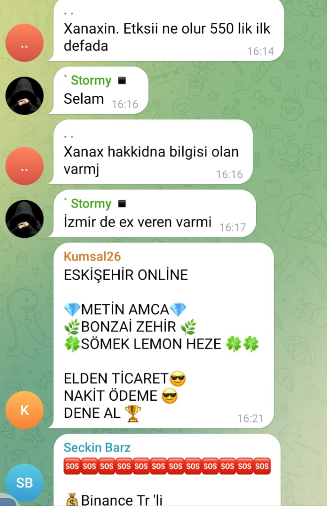 Bir tanesi çıksın beni dolandırdı desin”, “İstanbul’un en kaliteli ürünleriyle online”, “Ankara AMCA online gel gör dene al”, “Mari gram 400 TL, Şeker 120 TL, Amca 600 TL, Lirika tane 100 TL,”, Şekerden çok iyi anlarım diyen yazabilir mi”, “Konya elden ex lazım”, “Antalya mari lazım ibancılar işine baksın”, “Çerkezköy amca lazım elden ödeme” ile “İzmir al gülüm ve gülüm. Kuryesi olan yazsın.